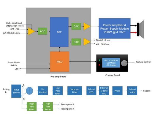 - DSP functions: 7 PEQs, LPF, phase, subsonic filter, limiter, mains delay, and HPF