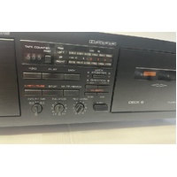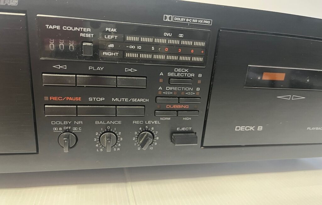A good quality dual cassette deck with soft touch push buttons operating the full logic control mechanisms. The design is quite elegant in that there’s only one set of motion controls that actuate both decks. When only one cassette is inserted it will automatically control that side – when you have two tapes in a selector button allows you to select which side you want to control.